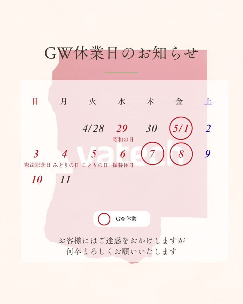 2026GW休業のお知らせ 【ゴールデンウィーク休業のご案内】5月1日(金)〜 5月10日(日)の期間、休業とさせていただきます。期間中のお問い合わせは、5月11日(月)以降にご返答いたします。ご迷惑をおかけしますが、どうぞよろしくお願いいたします。