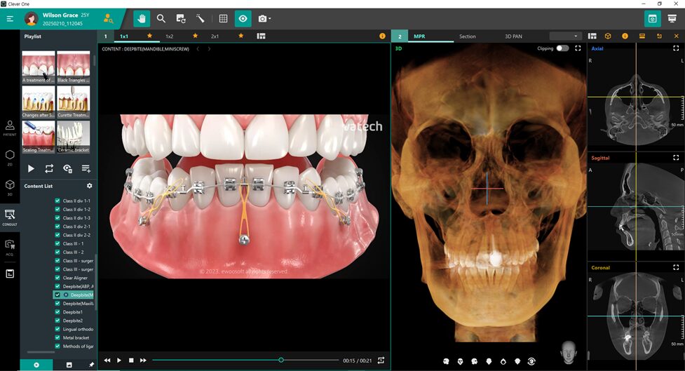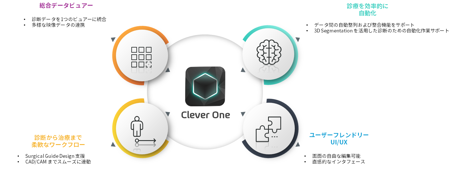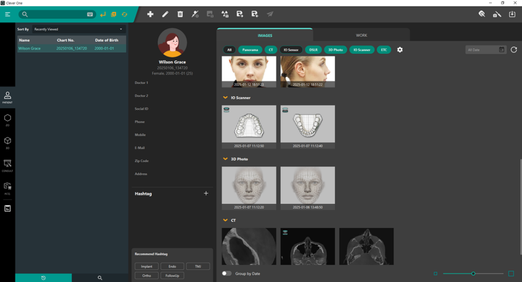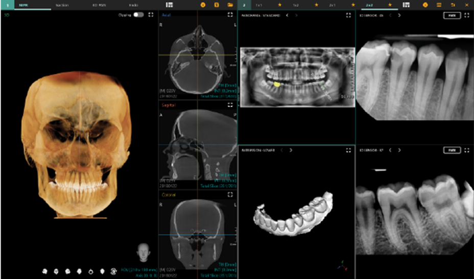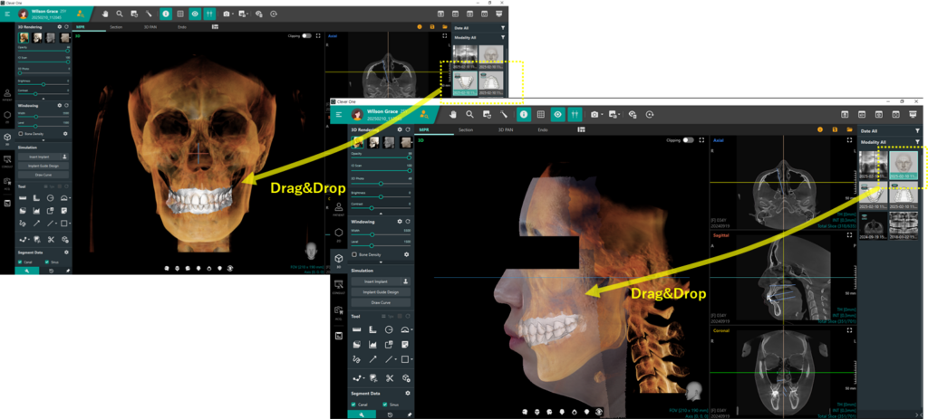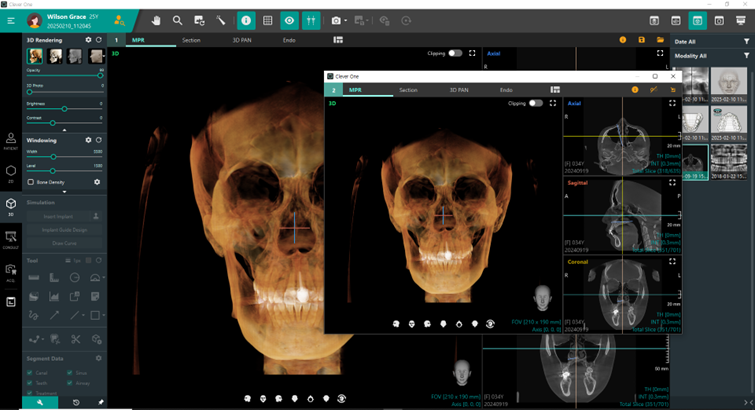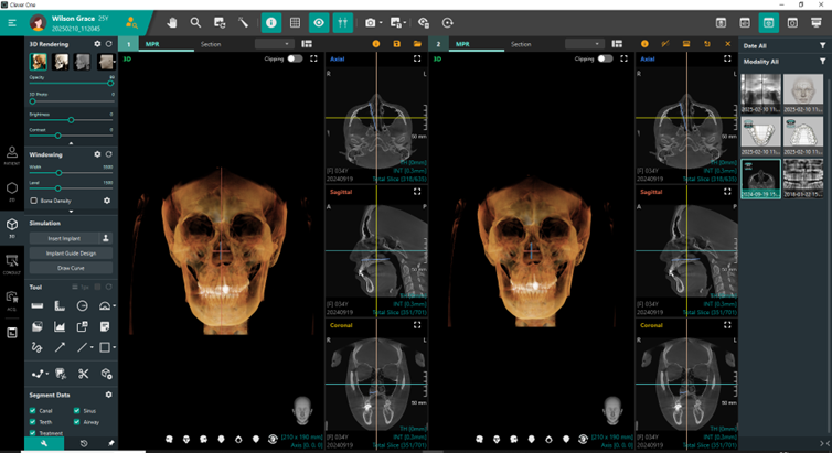 •Clever Oneは、パノラマ画像、CTスキャン、3Dフォト、口腔内スキャンをシームレスに統合し、ひとつのビュアーで表示